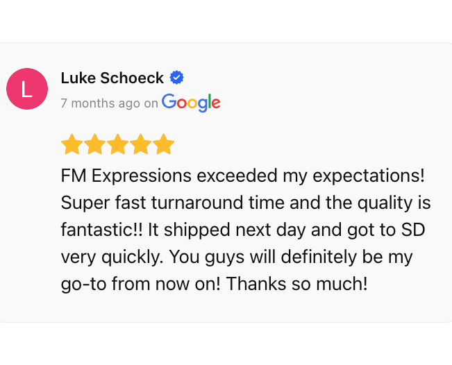Great quality, easy ordering process, and on time delivery makes FM a top choice for your transfer needs!