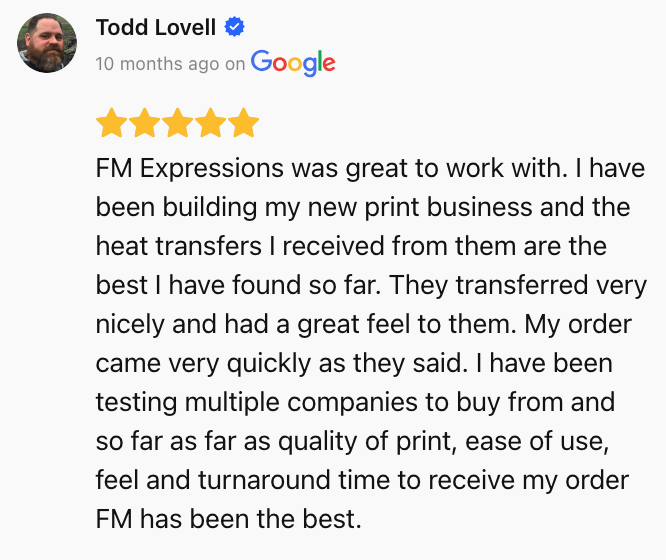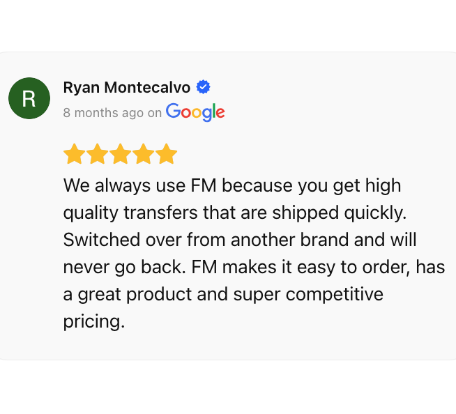 FM Expressions has produced professional heat transfers for over 40 years. Our solar-powered Virginia facility outputs over 200,000 transfers daily with quality checks on every order, so cheap pricing never means cutting corners on the product itself. Thousands of decorators across the country trust FM for affordable DTF transfers because the quality holds up, the shipping is fast, and the pricing is consistently competitive order after order.