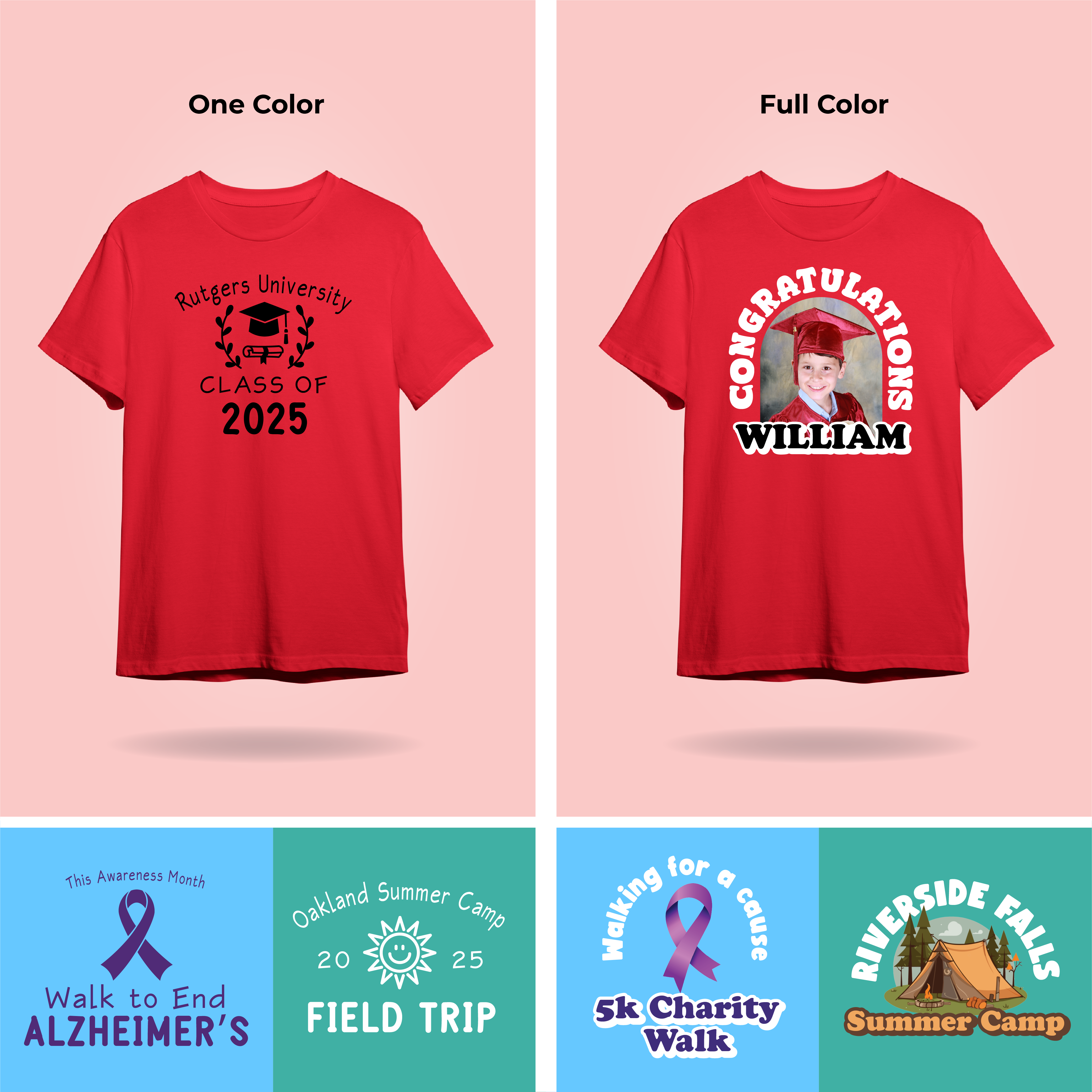 Two templates perfect for group attire. A One Color template is preloaded with selectable clipart while the Full Color template allows users to take their graphics to the next level.