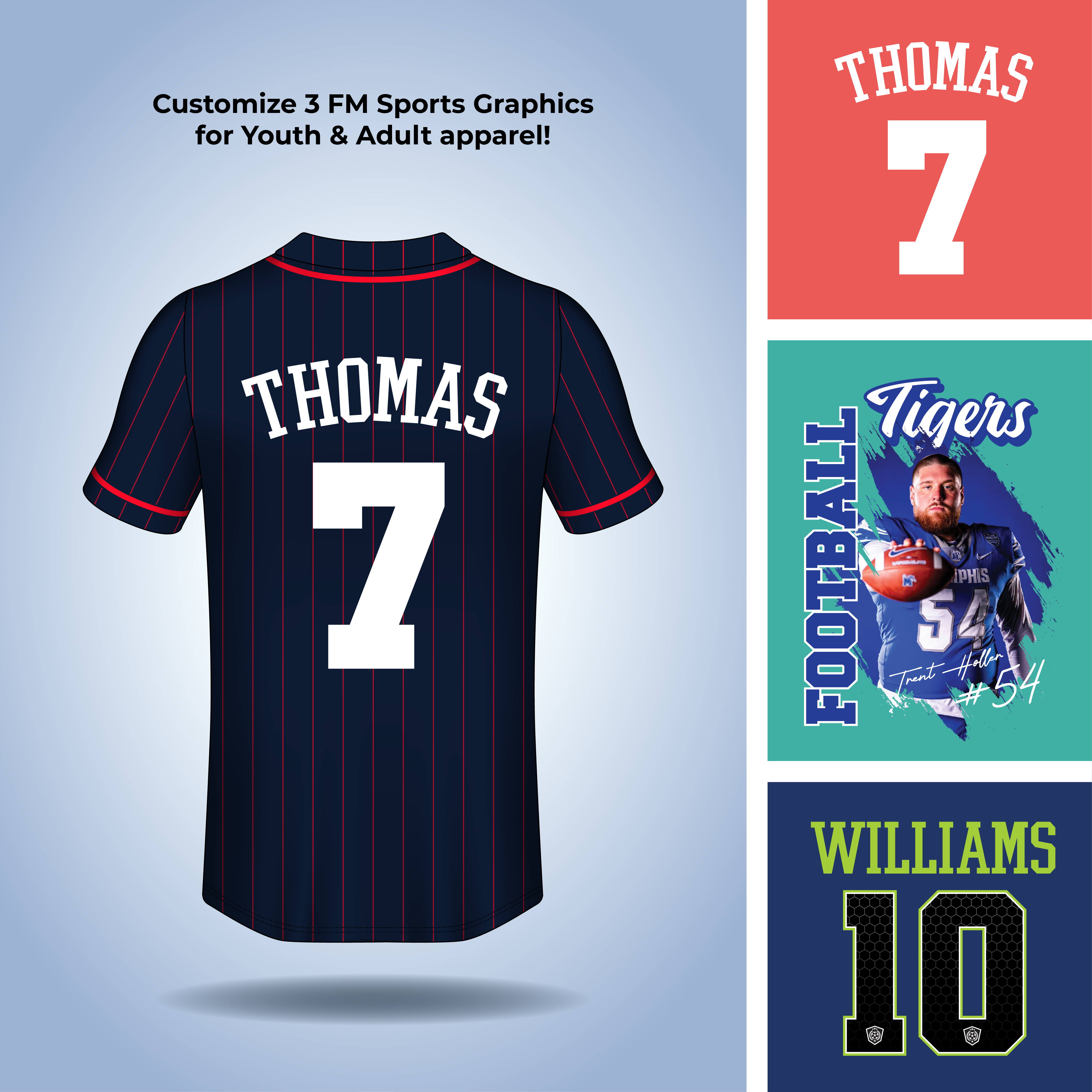 Three highly editable templates designed for sporty apparel. Templates include One Color and Full Color layouts from our Sample Pack (with options to add or subtract colors) and also cater to Youth & Adult uniform sizes.